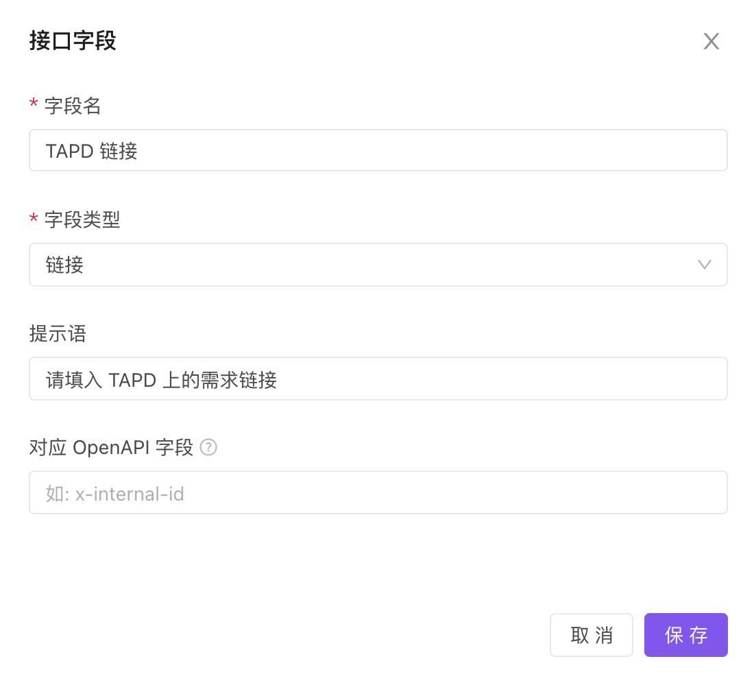”自定义字段“功能允许用户根据自己的需要,在接口文档中新增通用字段,比如:创建时间、TAPD 链接、需求文档链接等,以更加方便的管理项目。