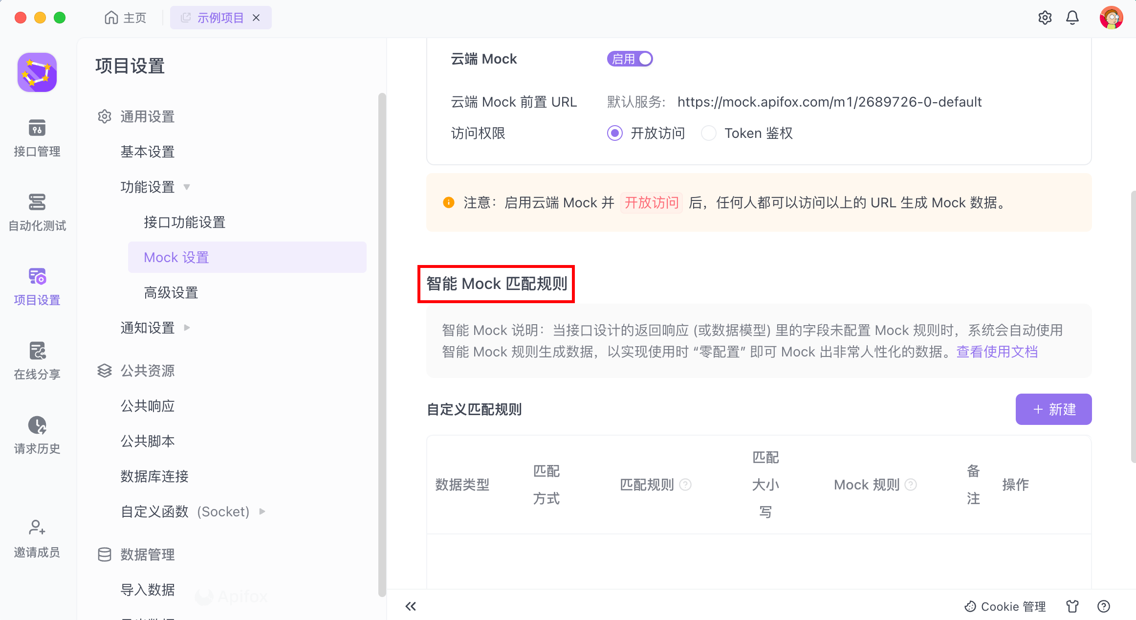 点击左侧菜单栏的“项目设置”按钮,轻点“功能设置”选项,在“智能 Mock”中可以设置“自定义规则”及“内置规则”。