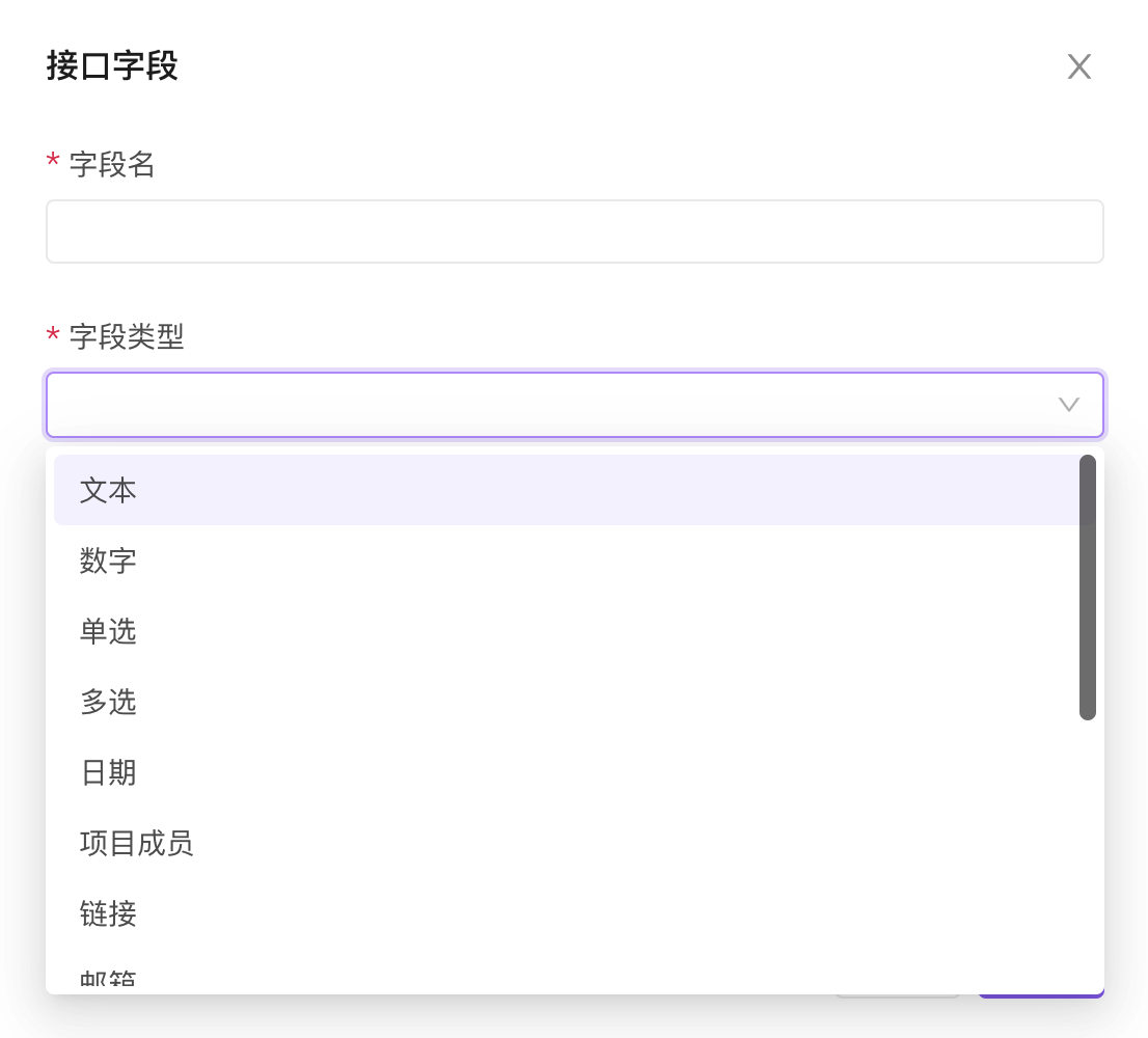 字段类型:支持文本、数字、单选、多选、日期、项目成员、链接、邮箱、单选标签、多选标签 (单选、多选支持管理者设置选项)