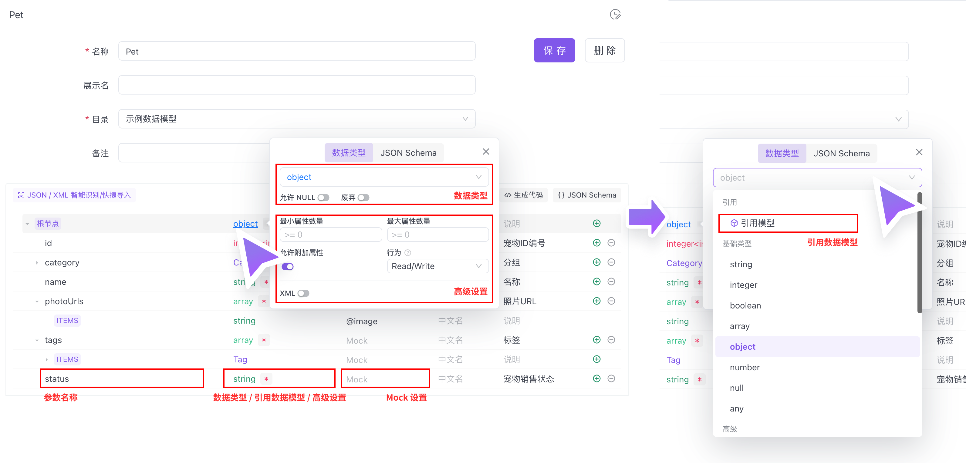 在 接口设计 的返回响应和 json / xml 类型的Body 参数处,在数据类型处可以引用已经建立好的数据模型,如下图。