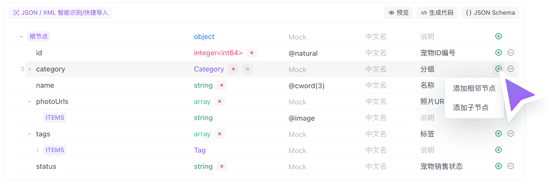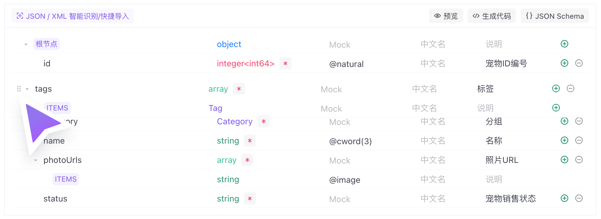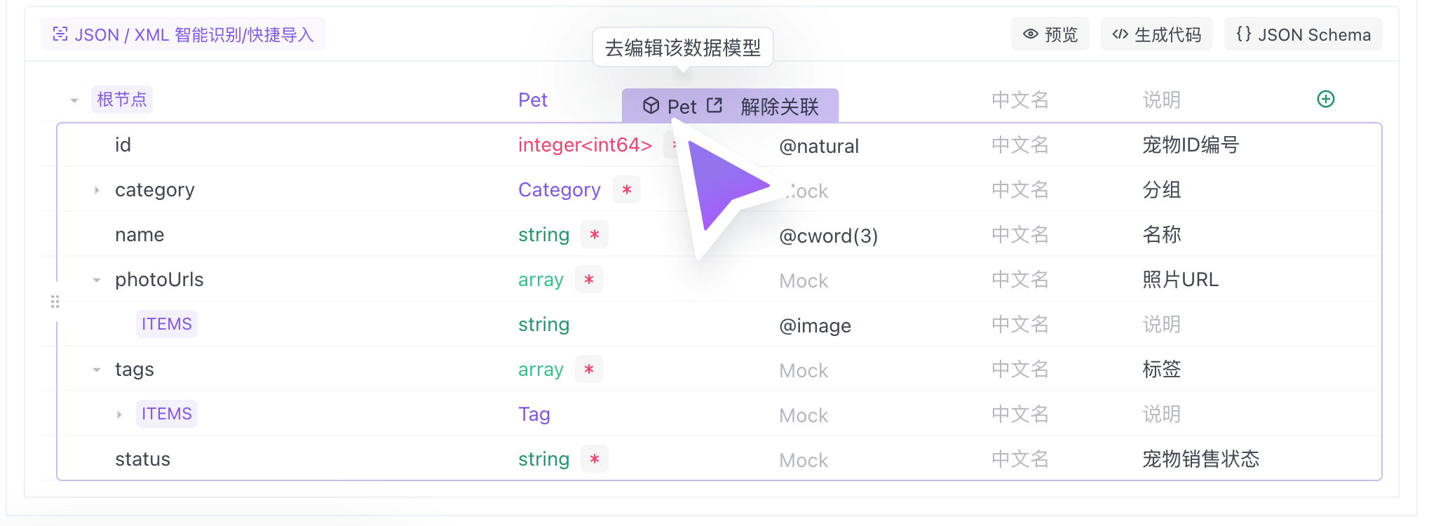 通过 JSON 数据自动识别生成数据结构,如果你已经有 JSON 数据了,这是一个快捷生成的方式。