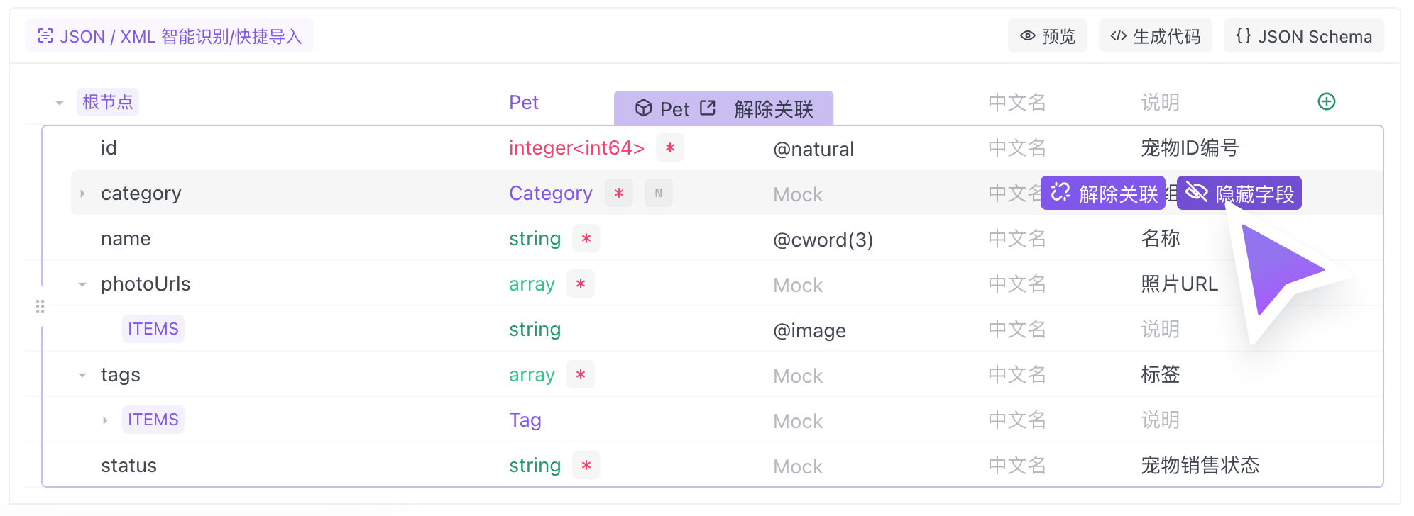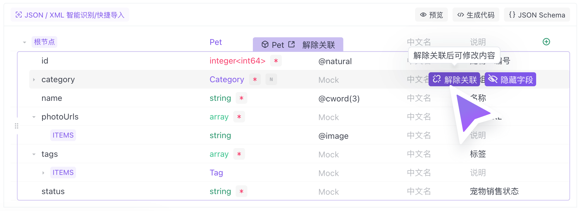 在 2.1.39 版本之后。当字段已经存在 mock、中文名、说明时,使用智能合并。导入相同字段,新导入的部分不会覆盖原有的 mock、中文名、说明。