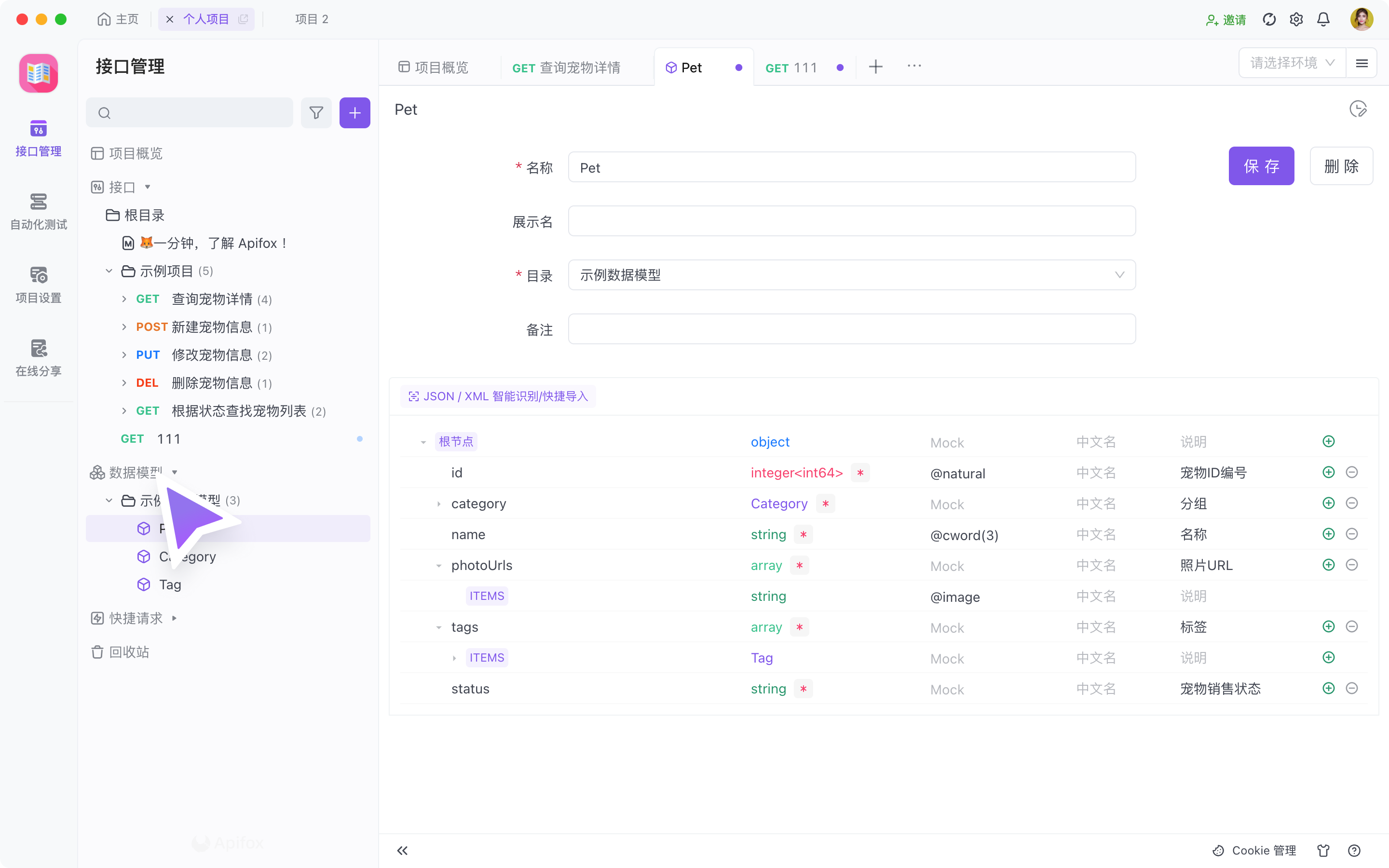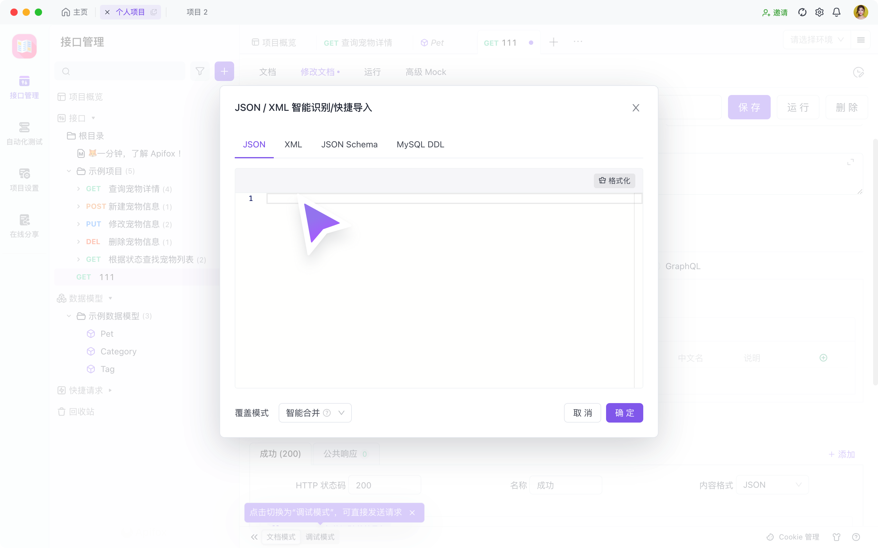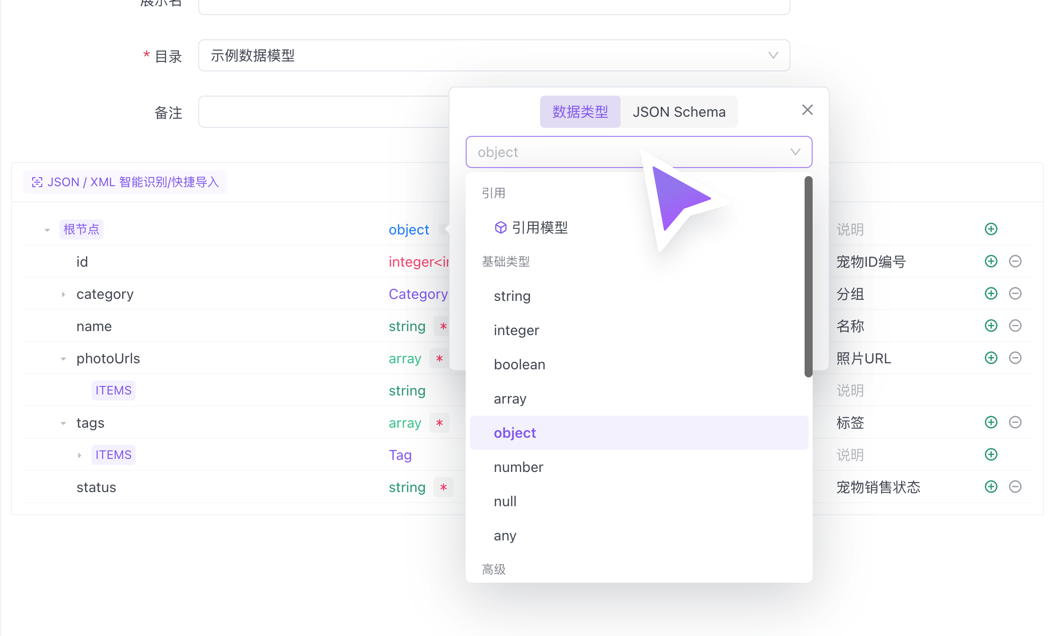 Apifox 的数据结构和数据模型是完全遵守 JSON Schema 规范 的,所以可以直接编辑 JSON Schema 的方式来定义数据结构。参考文档:JSON Schema 介绍