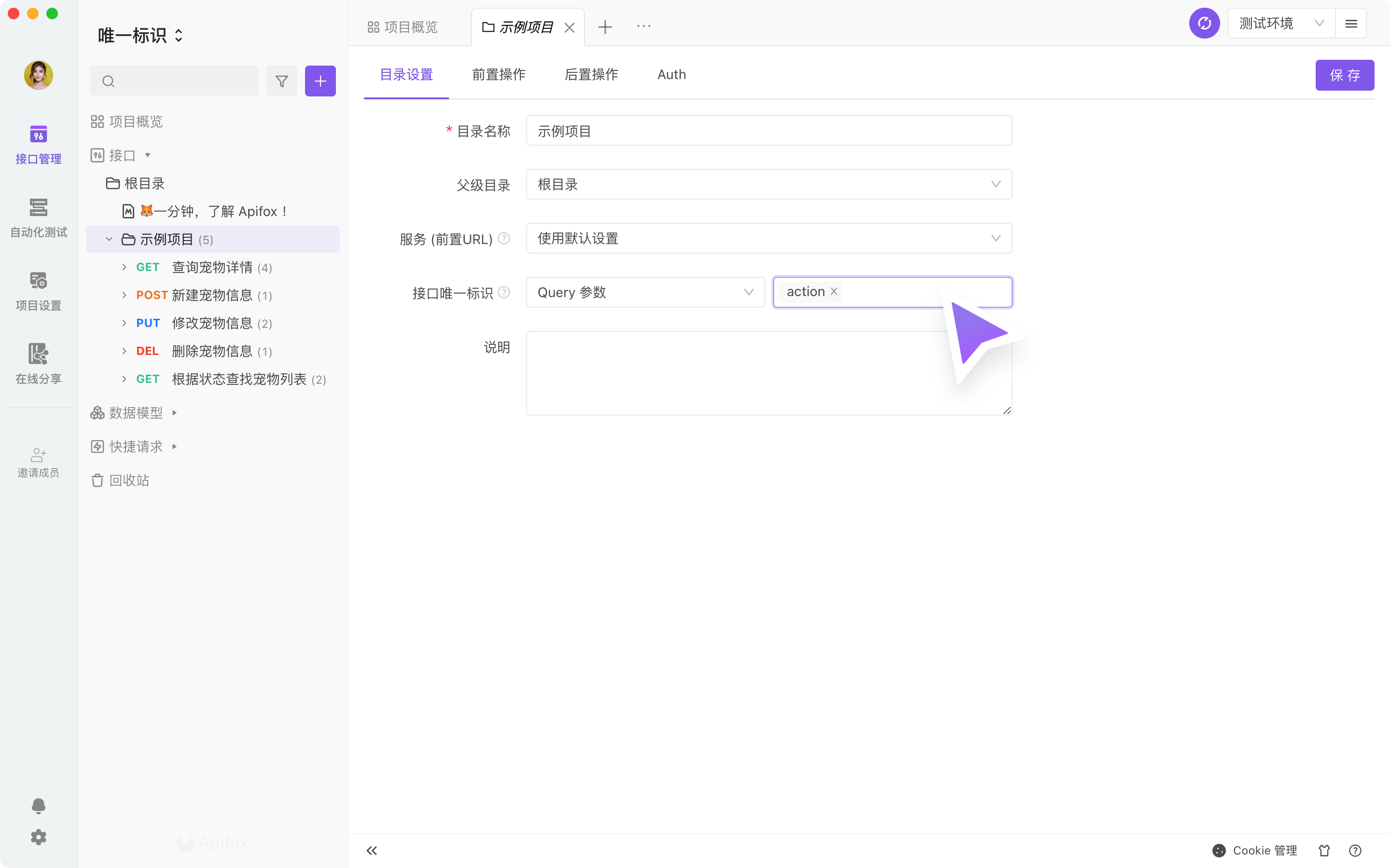 固定值的功能的用户,不用担心,功能依然会保留。但固定值在导入时是根据 URL 进行覆盖判断的,建议已经使用固定值功能的用户使用接口唯一标识功能。 接口唯一标识功能支持设置多个参数。- 如果你的目录中,只有某个子目录特殊设置为