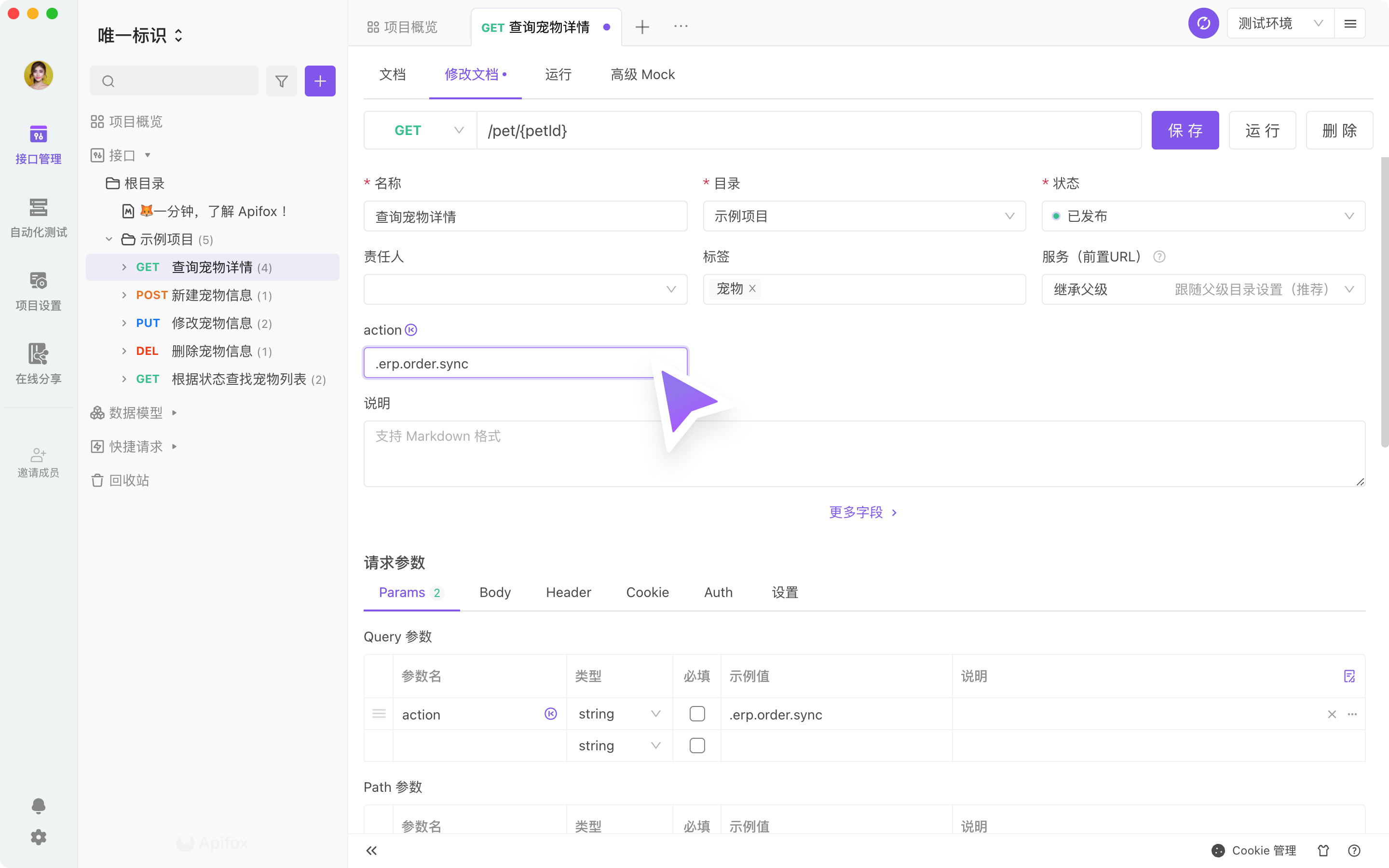 举例:某一个电商 API 接口,以 Query 参数 的参数 action ,作为 接口唯一标识 的参数。在下图选择为 Query 参数 后,在其右侧的输入框中输入对应的参数名。