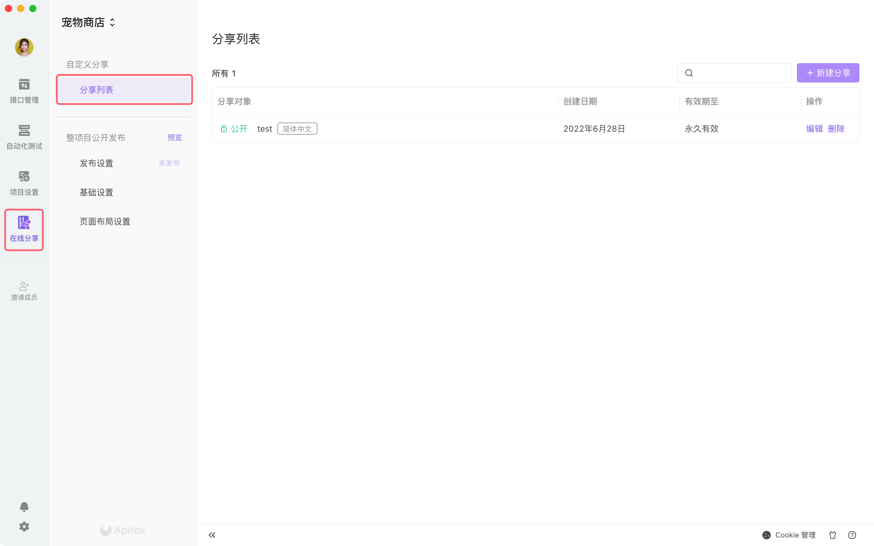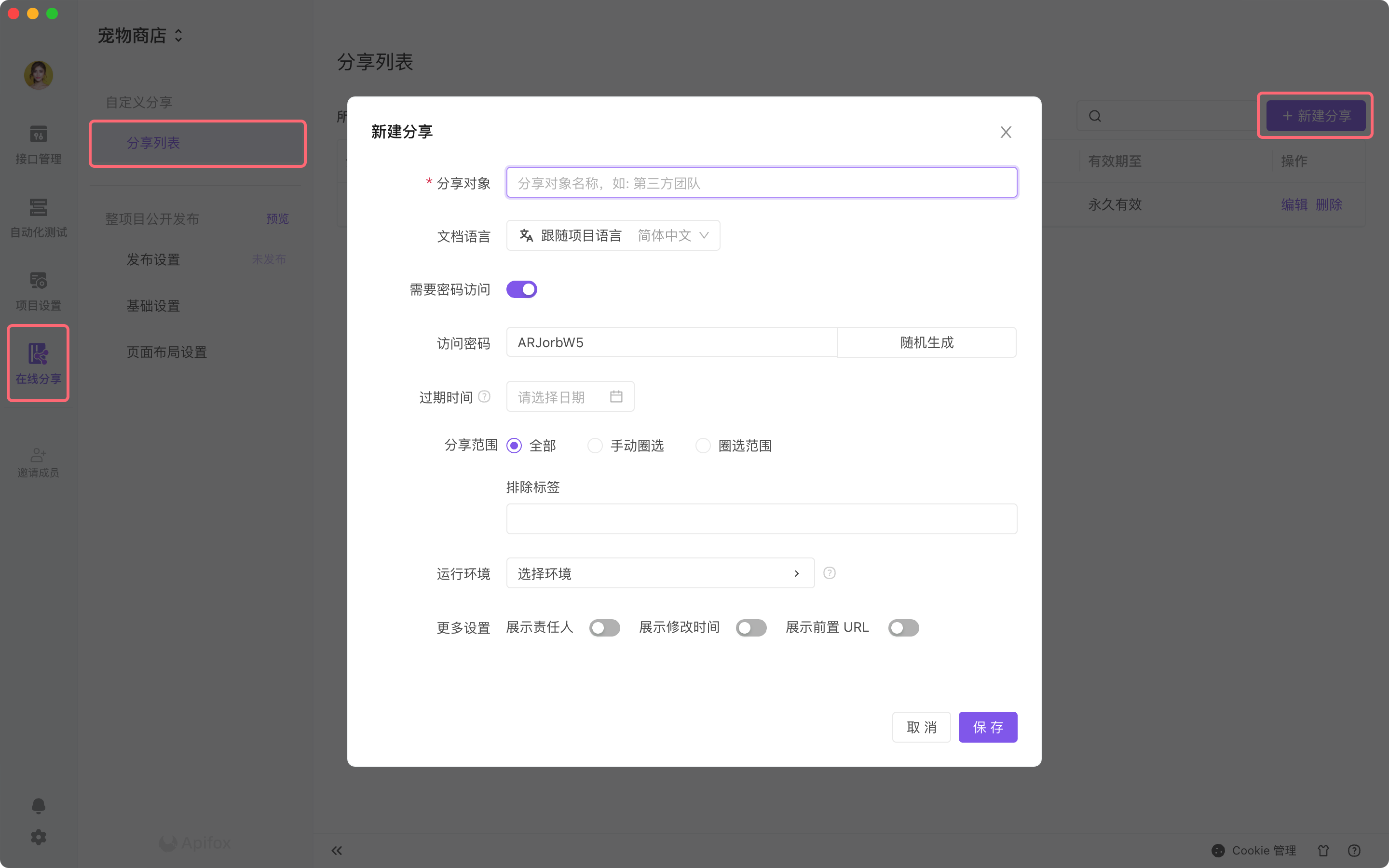- 分享范围:可以选择项目全部,也可以选择部分接口,也可以根据标签维度导入