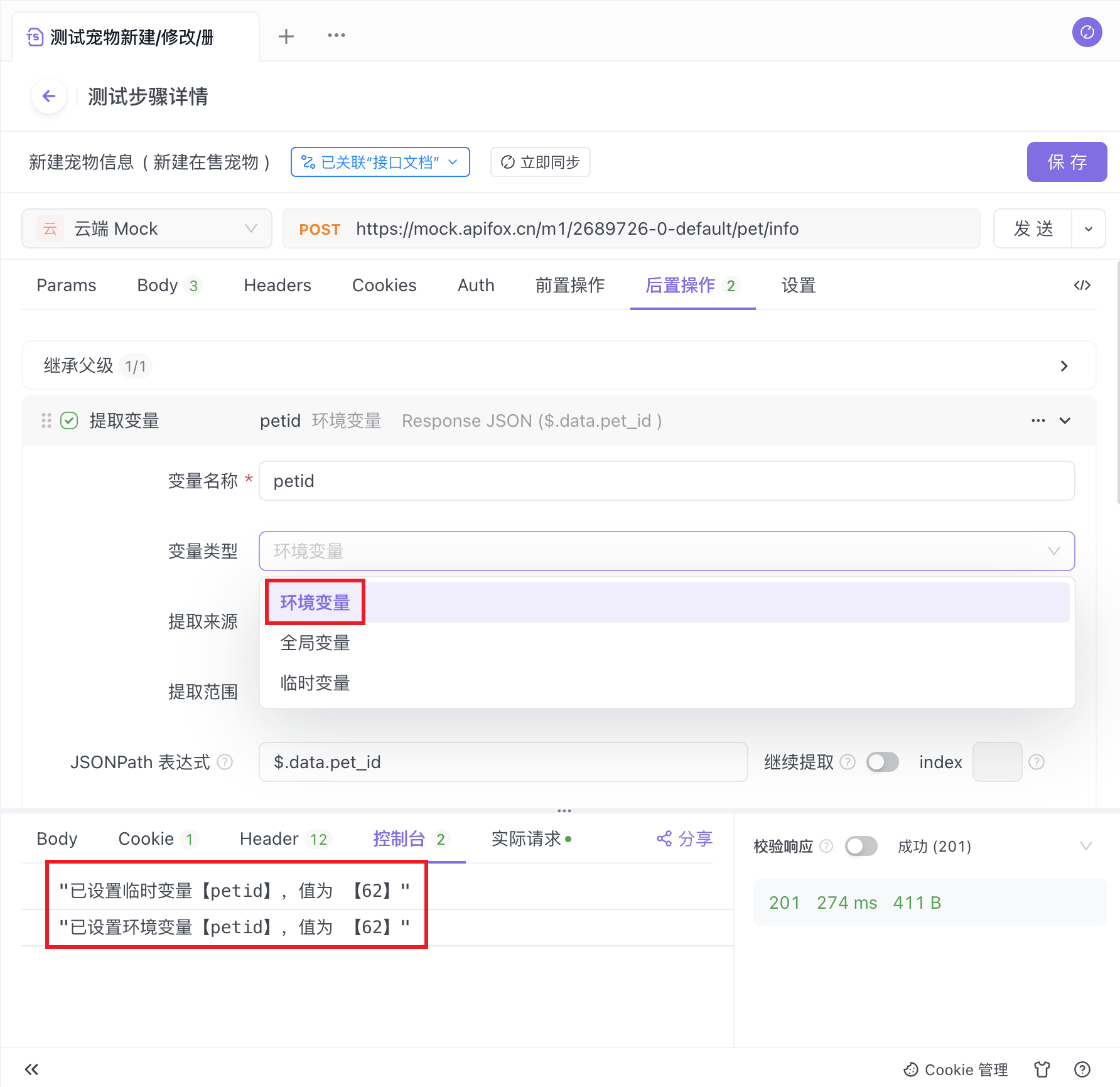 在 A 接口的后置操作中添加“环境变量”操作,并在其中定义变量名称 petId 和 JSONPath 表达式。若想要提取返回数据中 data 结构里的 pet_id 参数,那么应在 JSONPath 表达式填写 $.data.pet_id。