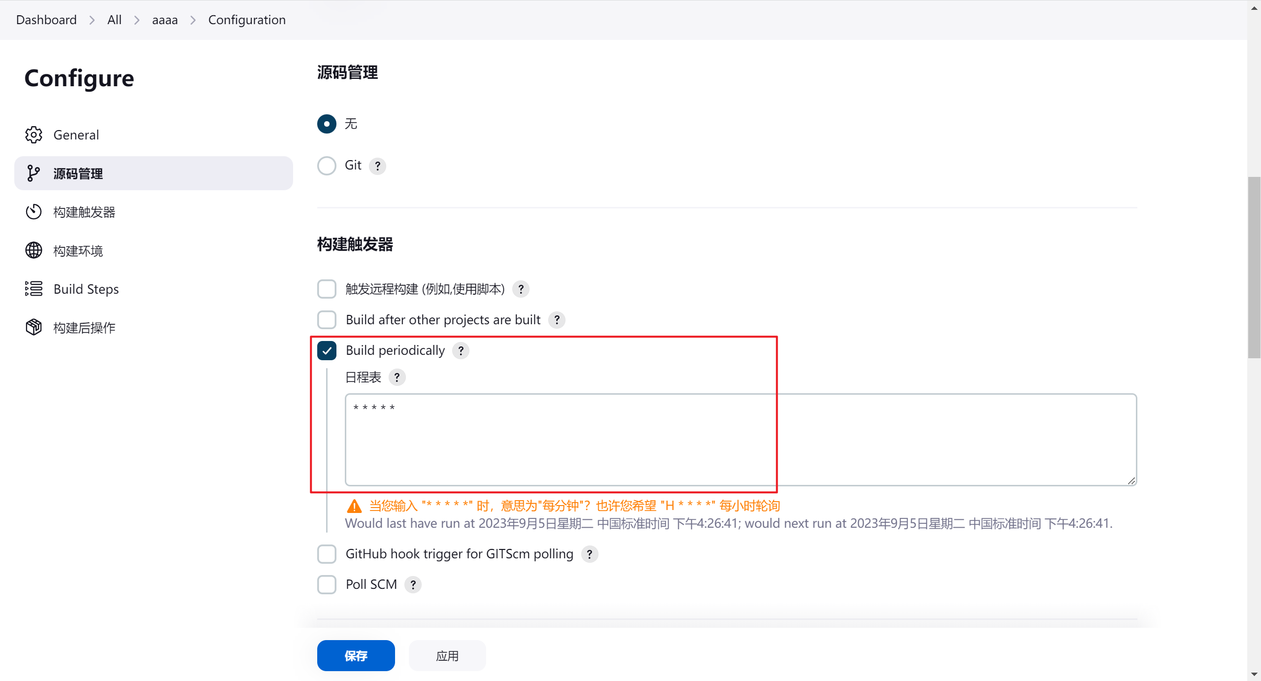 在 「项目配置(Configure)-> 构建触发器」处,勾选「定时构建(Build periodically)」,然后在日程表里写上 cron 表达式即可,比如要每分钟触发一次,你可以使用 cron 表达式:* * * * *。