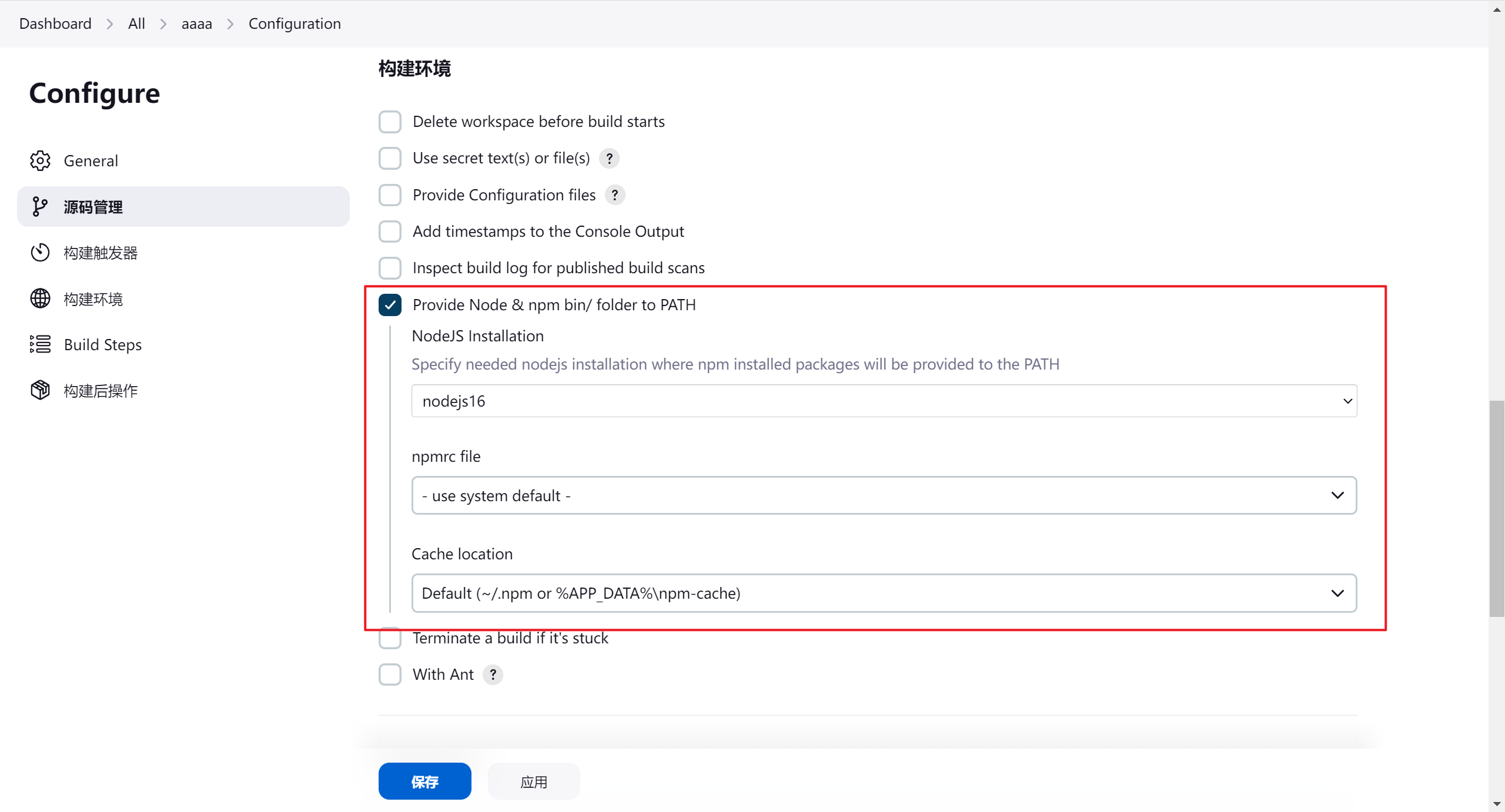 在 「构建环境(Build Environment)」 中设置 Node 信息,如果配置有多个 Node,可以根据需要选择对应版本。