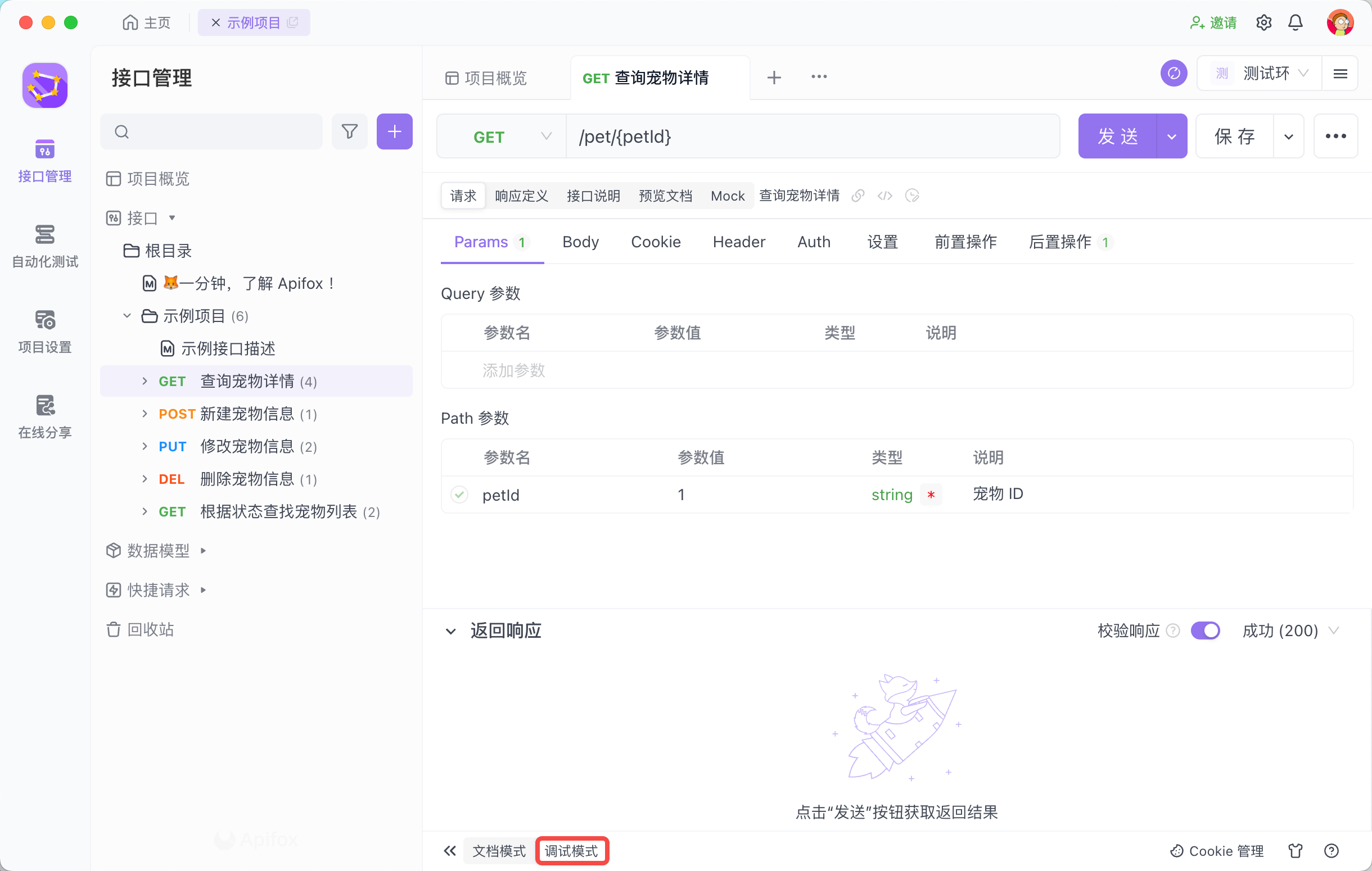 调试模式适合习惯于先行进行接口参数调试,再生成接口文档的团队。在调试模式下,开发者只需要编辑界面中接口参数,修改后即可直接发送请求,保存后生成文档。