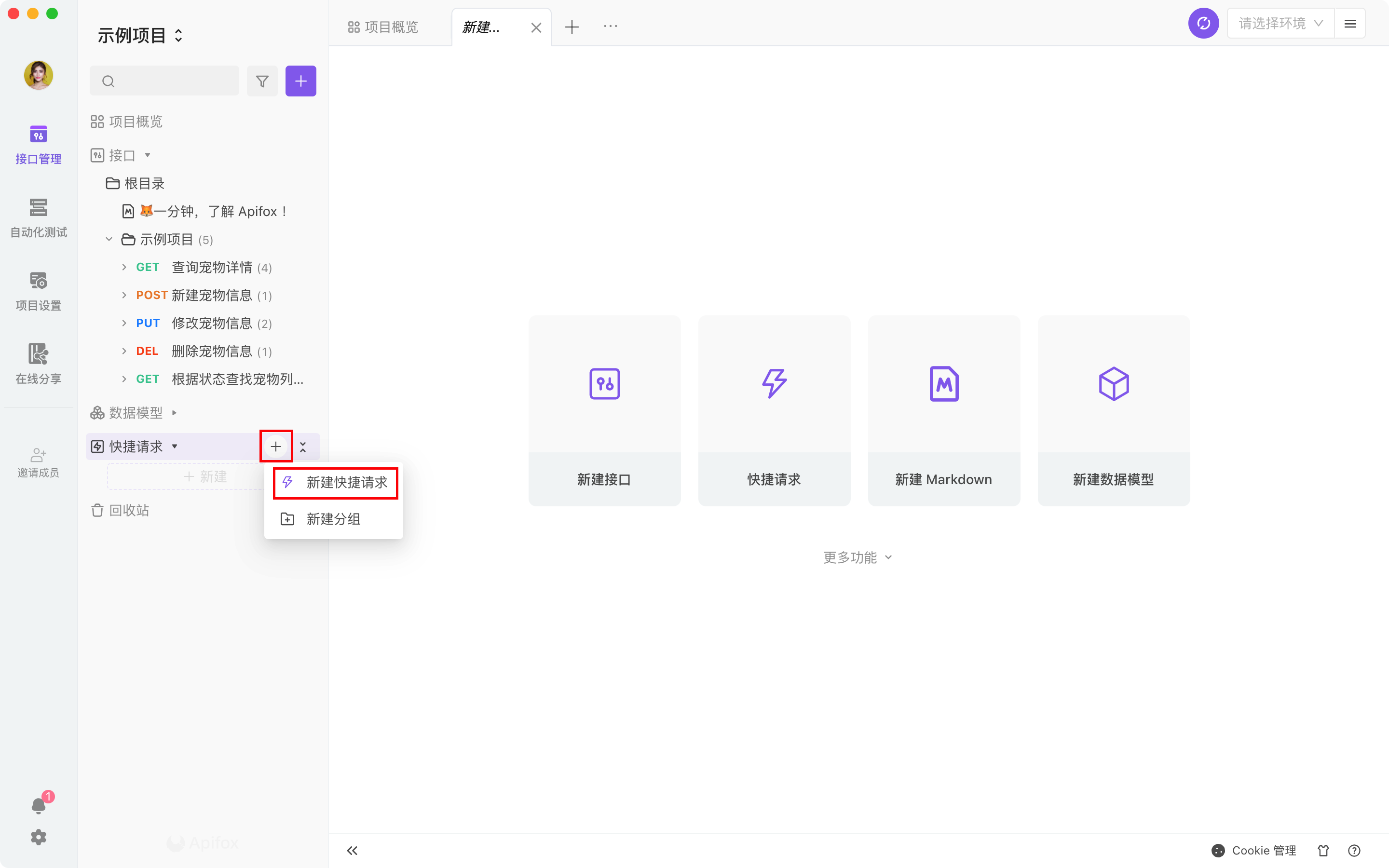 接口调试快捷请求本页总览快捷请求视频内容下文将以一个简单的 HTTP 接口为例,详细说明如何使用 Apifox 发起接口请求并接受调试响应。新建快捷请求鼠标移到左侧搜索框旁边的 + 号按钮,在下拉列表里选择快捷请求。你也可以将鼠标移动到左下侧的功能菜单,并在快捷请求右边点击 + 号按钮。输入接口 URL 及参数后轻点“发送”按钮。发送请求后查看响应结果。注意如果输入的 URL 未添加 http:// 或 https:// 作为起始参数,那么实际发出请求的时候将会自动加上当前环境中的前置 URL。保存为接口调试完成后,若此接口可以在后续复用,可以选择保存为快捷请求或接口文档在左侧目录管理已保存的快捷请求。