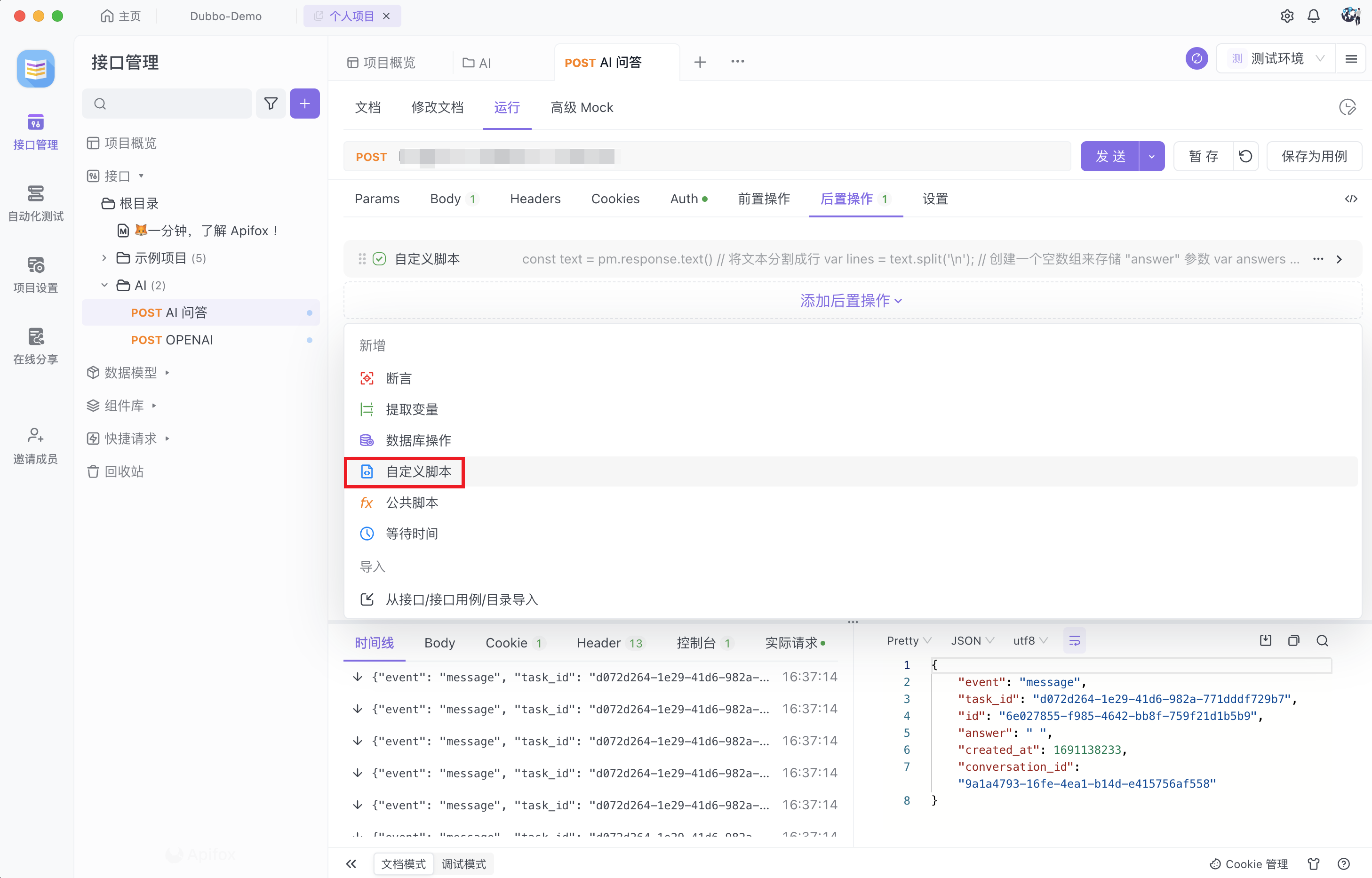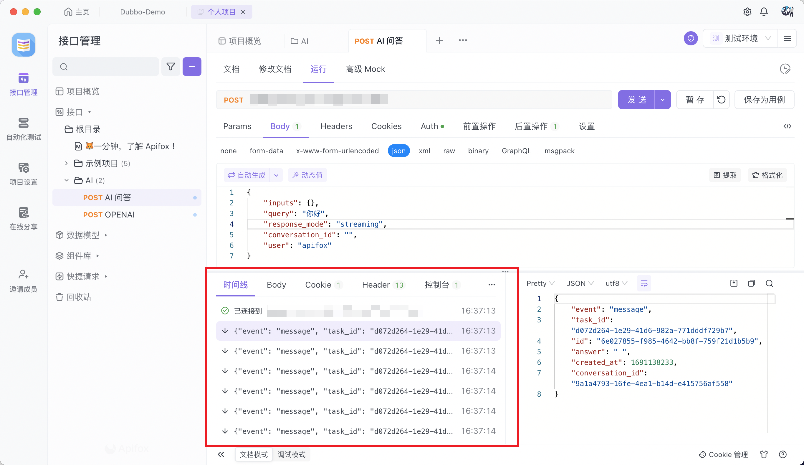 在 HTTP 项目中新建接口。发起请求后,当接口返回的 Content-Type 包含 text/event-stream 时,Apifox 会自动将返回的数据解析为 SSE 事件,并以全新的时间线视图实时更新响应内容,而不必等待服务器关闭连接。