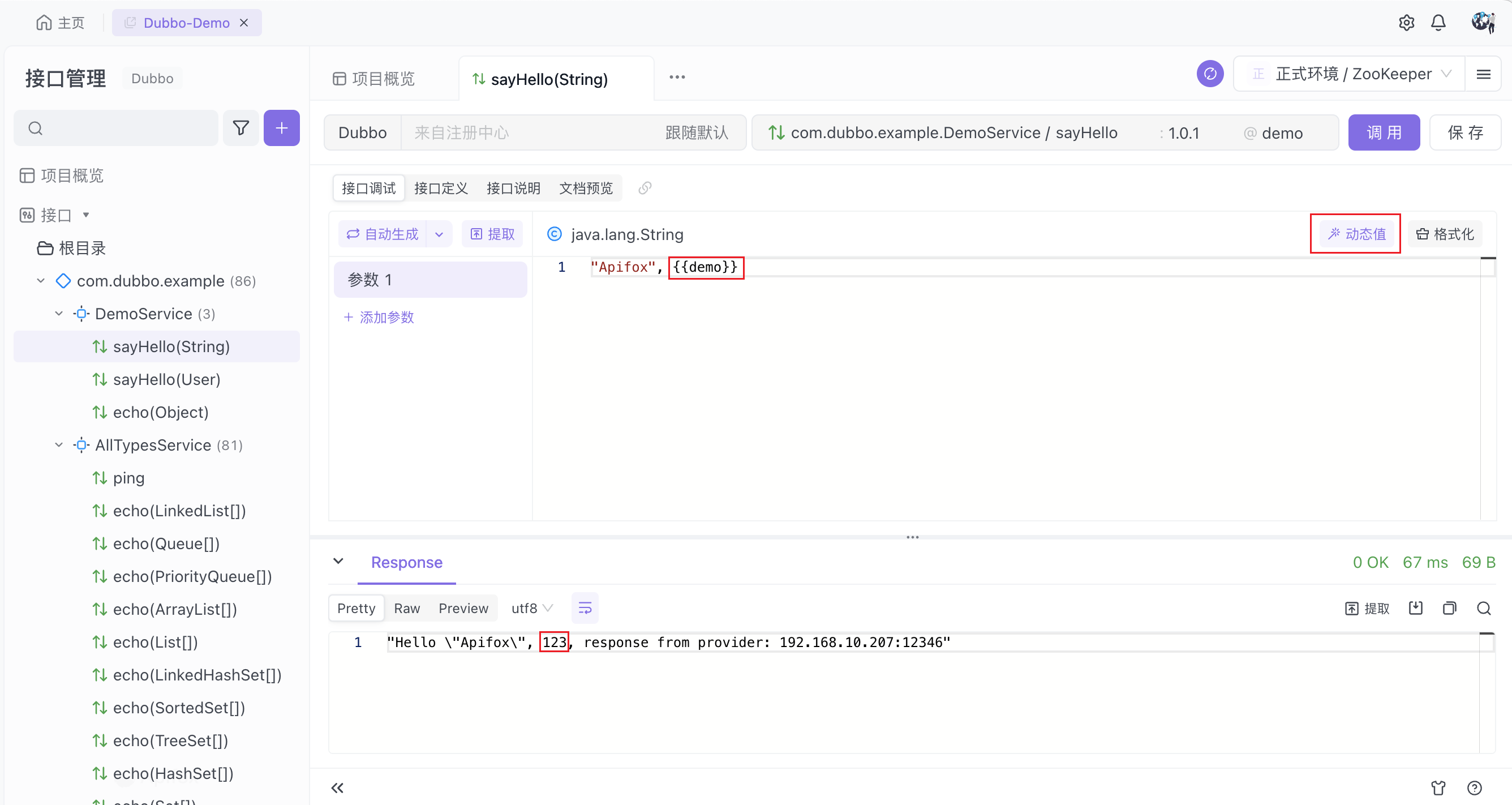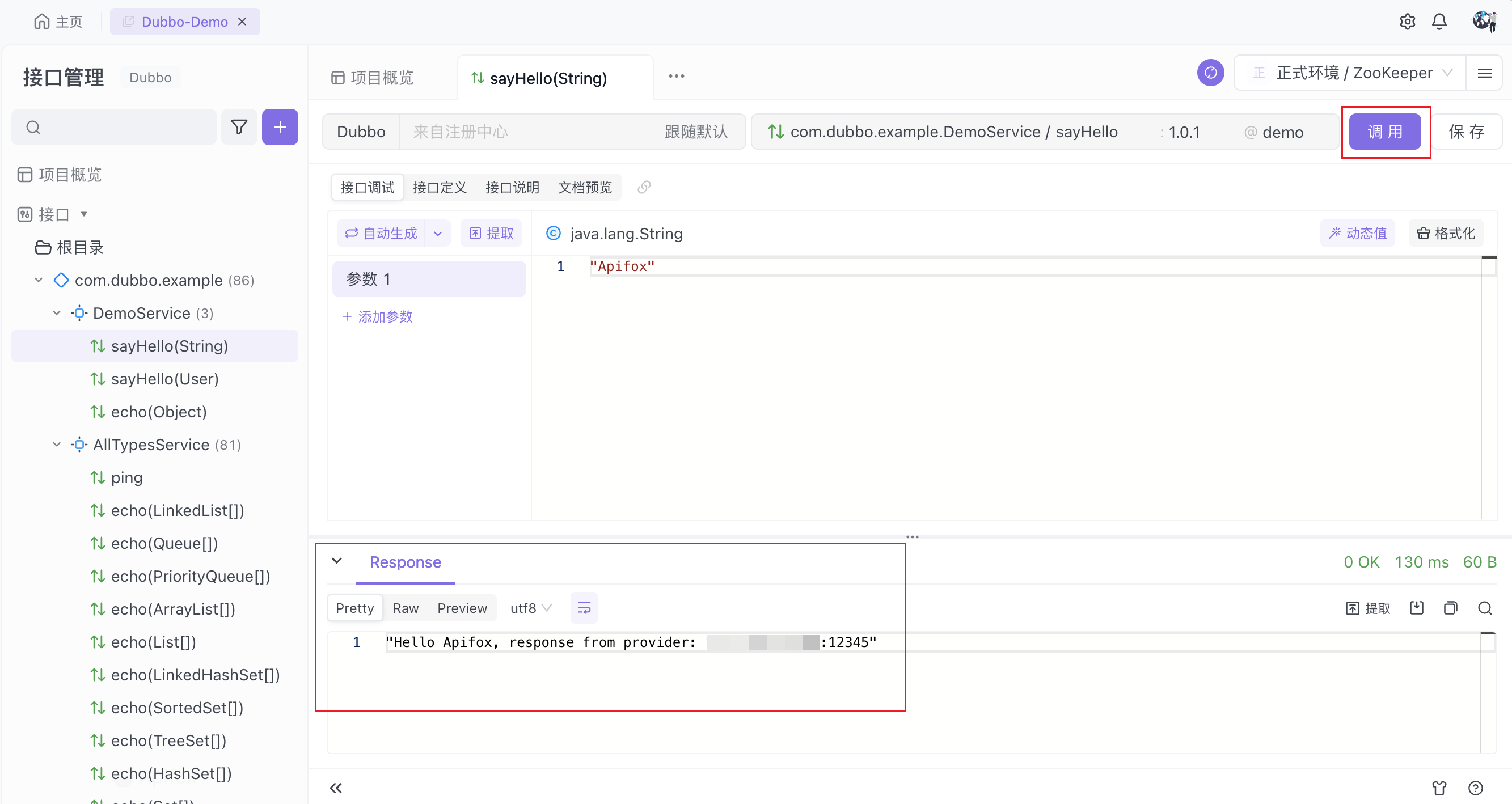 如果 Dubbo 接口具备有效的响应定义,那么在调用接口后,Apifox 会自动对响应进行校验,与 HTTP 接口的调试体验保持一致。