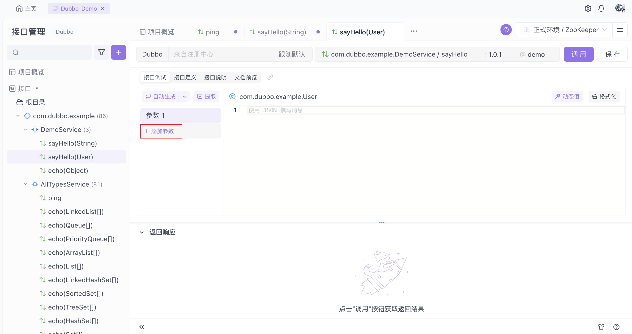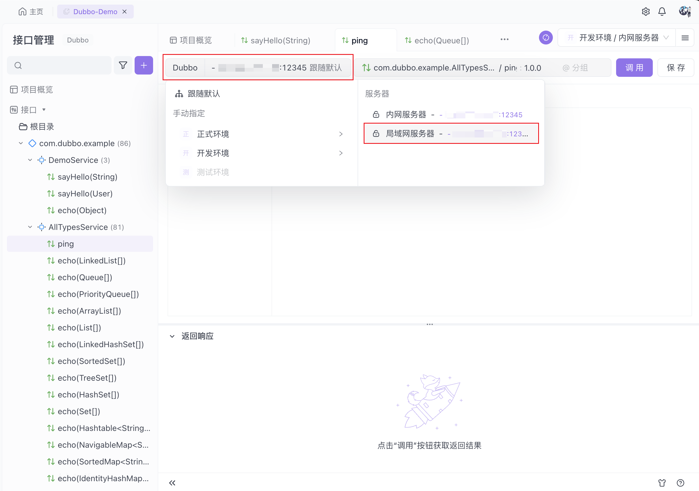 开始调试接口前需定义目标服务器地址,你可以通过直连服务器或通过注册中心两种方式进行调试。
