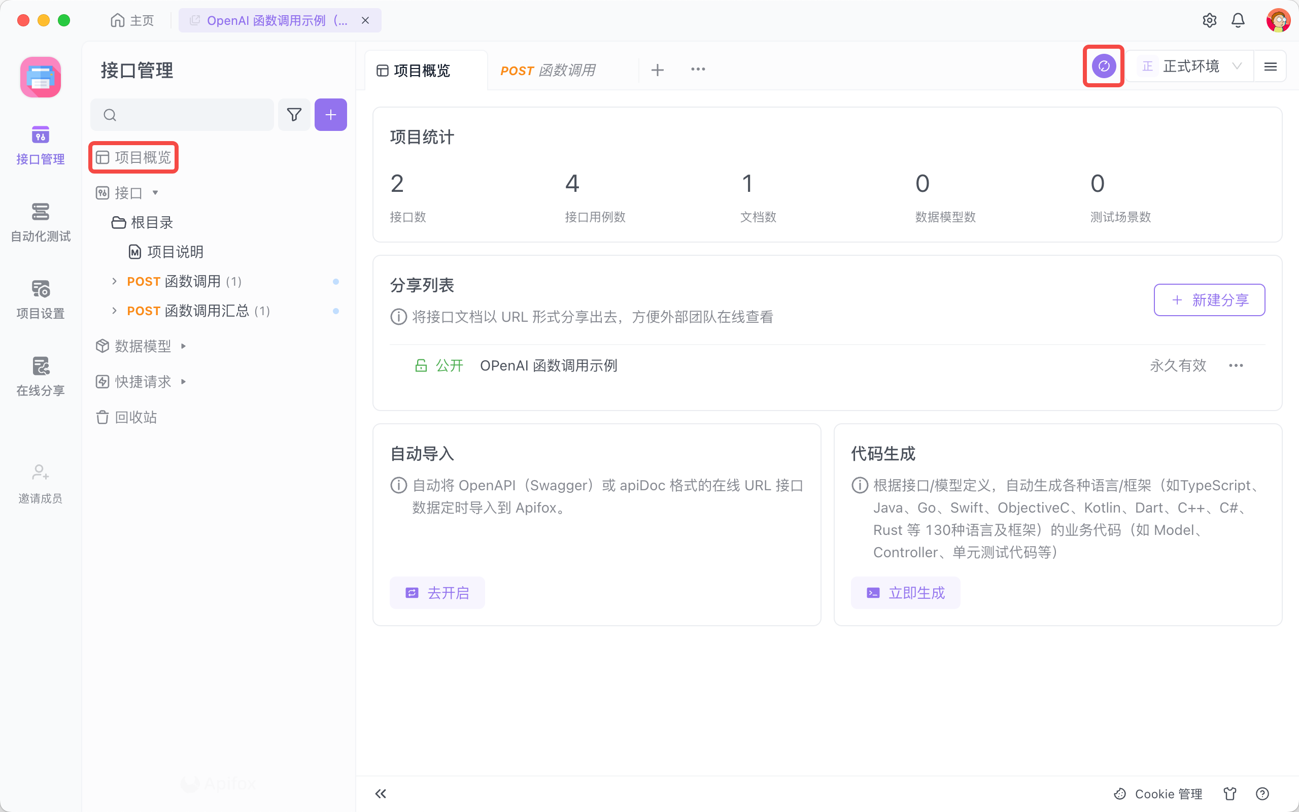 - 进入 Apifox 客户端中的项目后,点击右上角的“刷新”按钮。