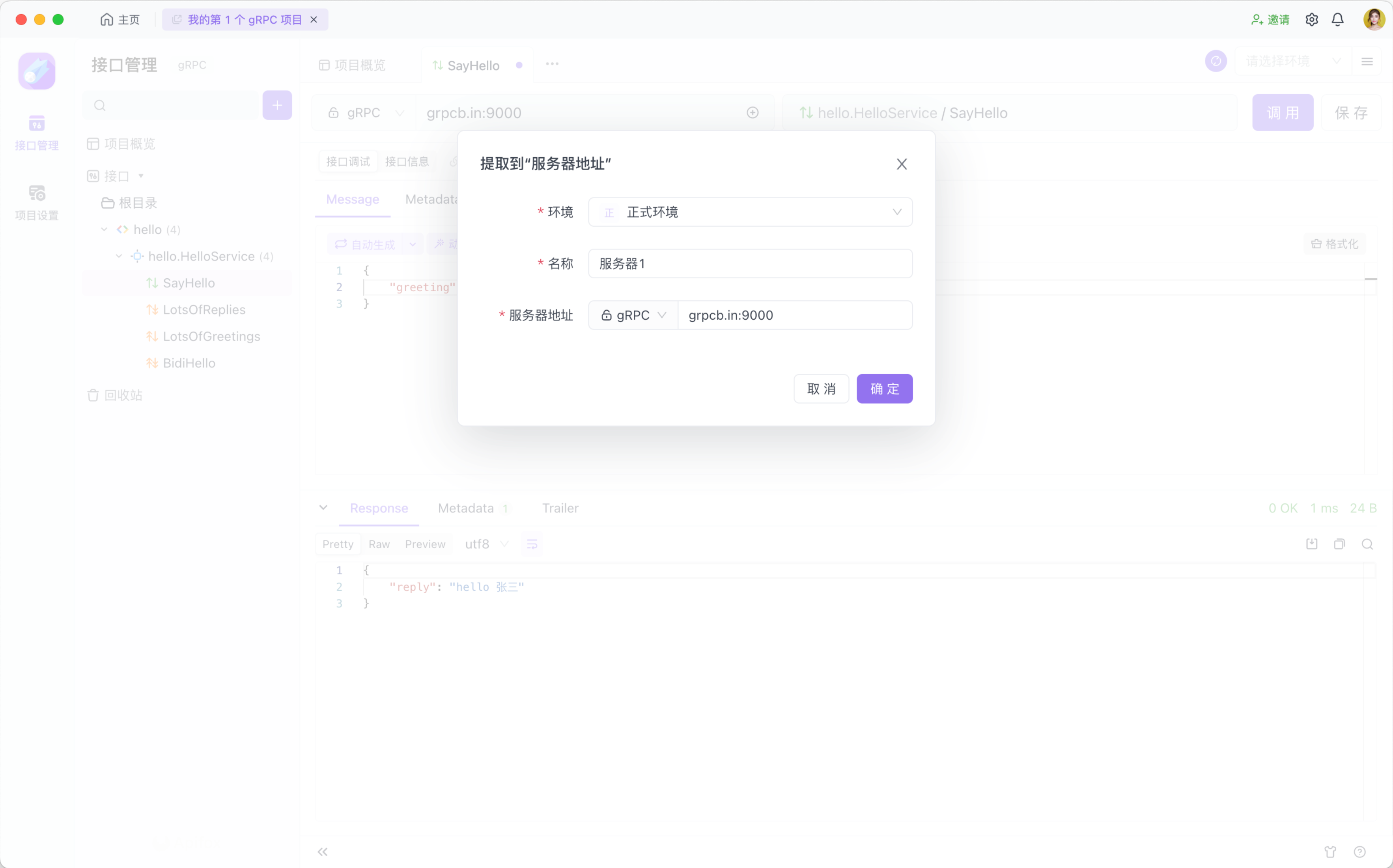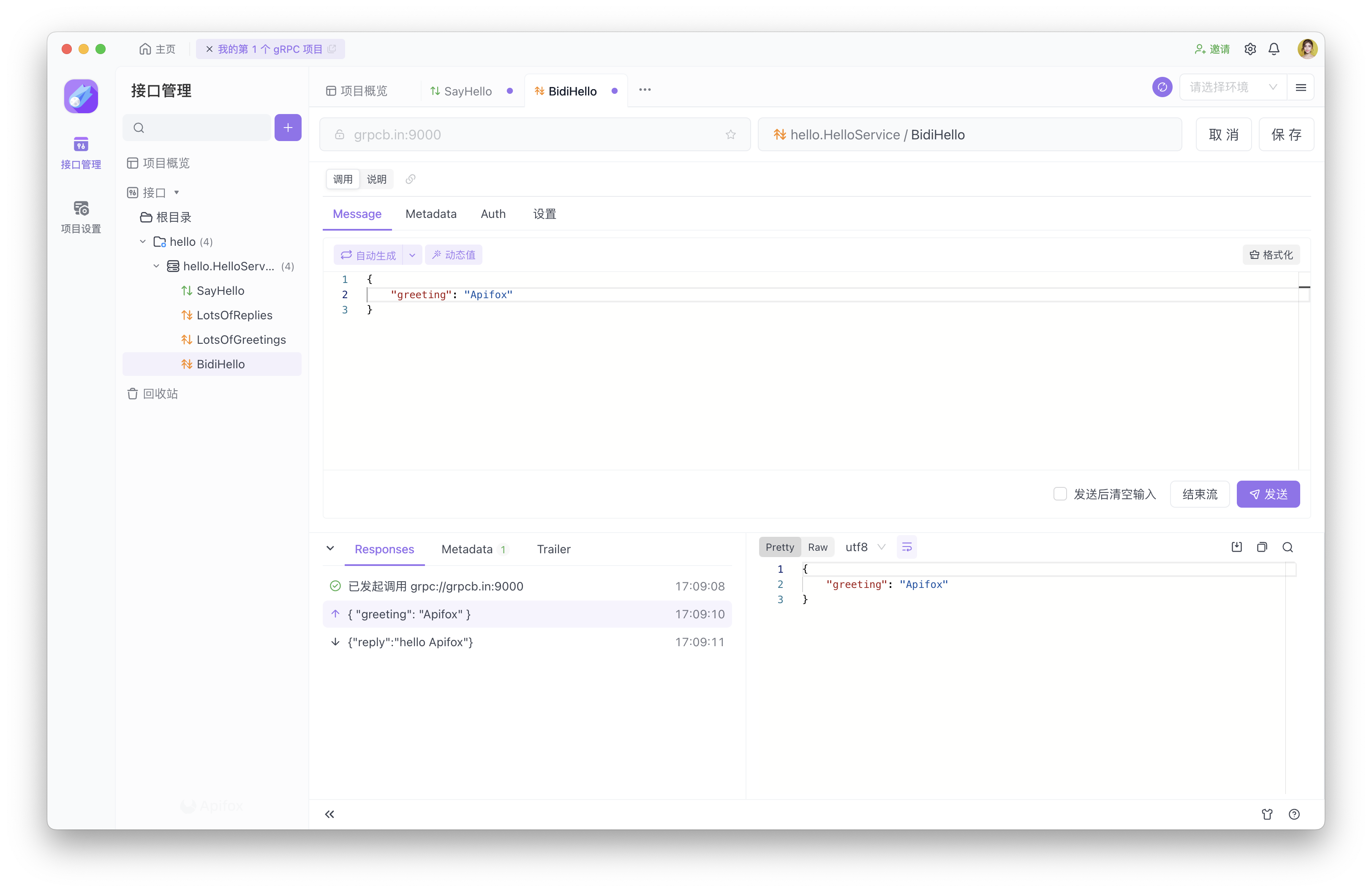 你可以在 gRPC 的消息和 Metadata 中使用 Apifox 变量。