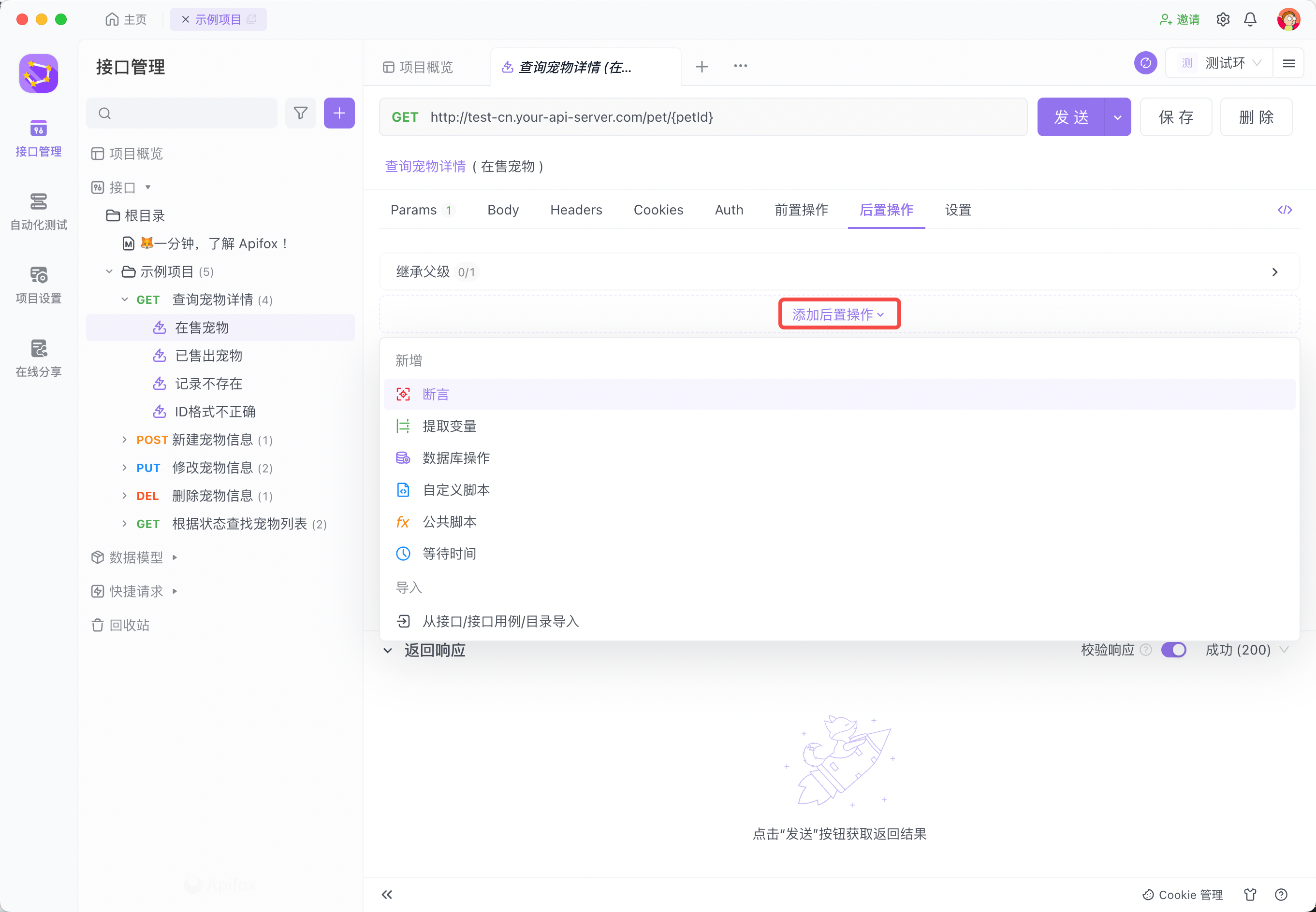 发送接口请求后执行的代码片段也称为后置脚本。主要用来断言请求返回的结果是否正确、将请求返回的结果数据写入环境变量等场景。