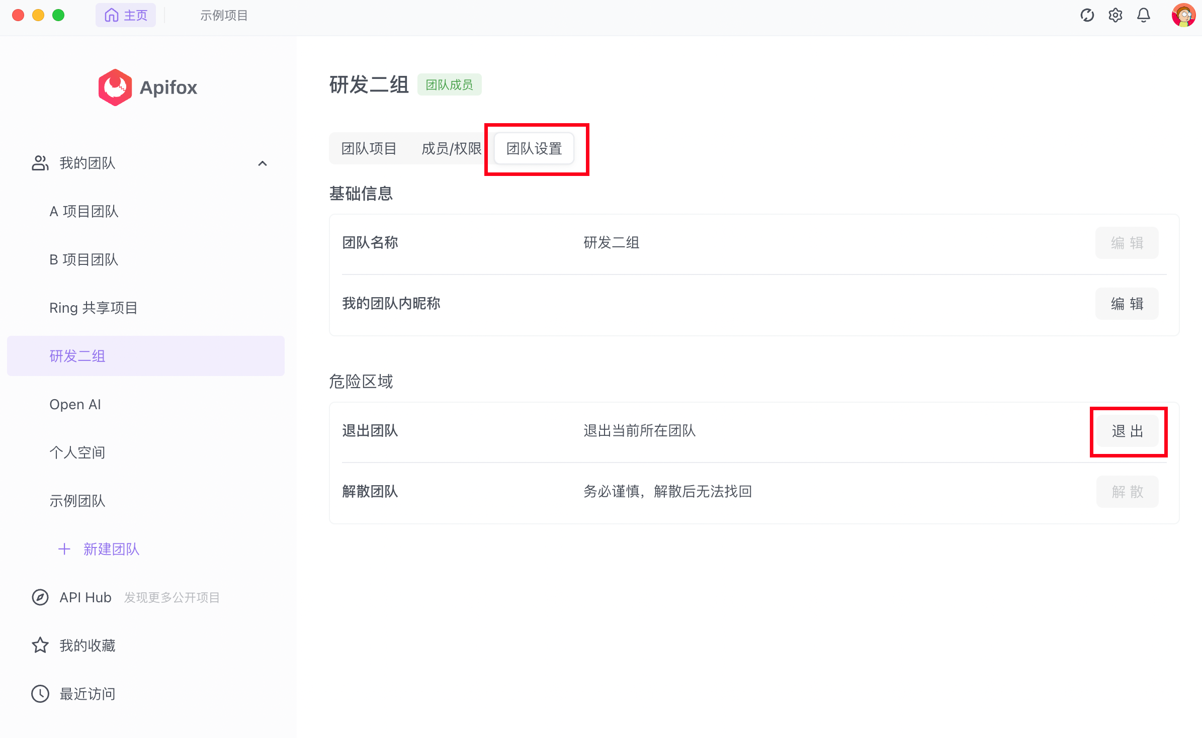 团队成员可通过「团队设置」->「危险区域」->「退出」,退出团队。
