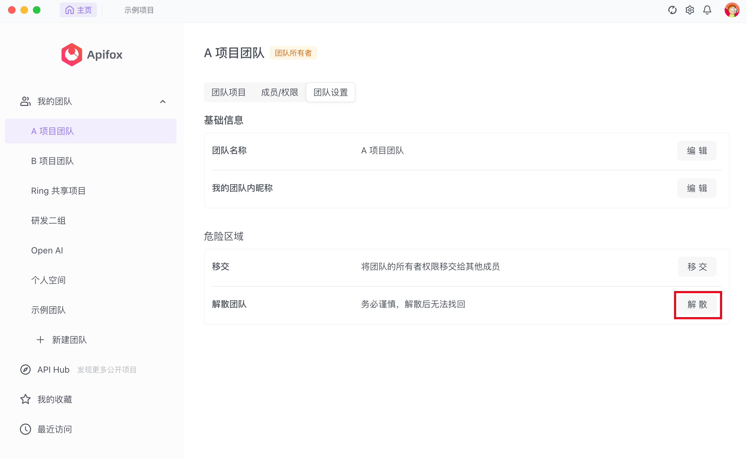 解散团队后,该团队下的所有项目都将被同步删除,且不可恢复。