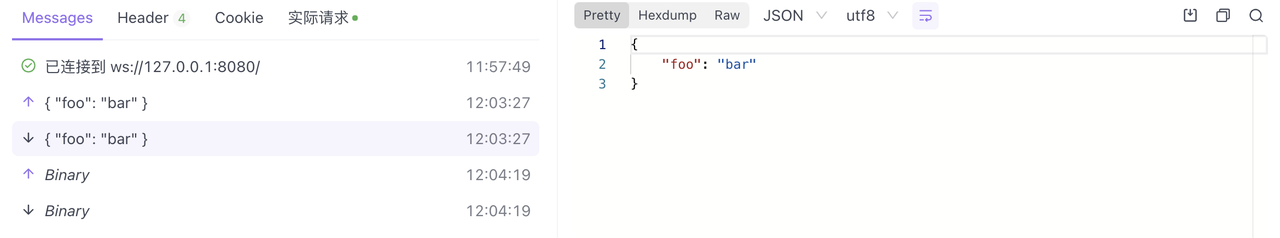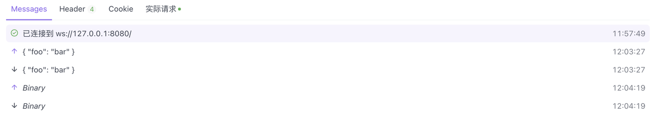 下方的 Messages 按照时间顺序集中展示连接状态、发送的消息、收到的消息。